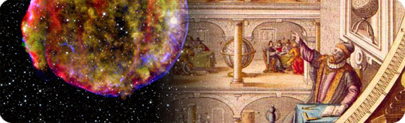 Tycho Brahe points to the "new star" with a recent image of the supernova remnant